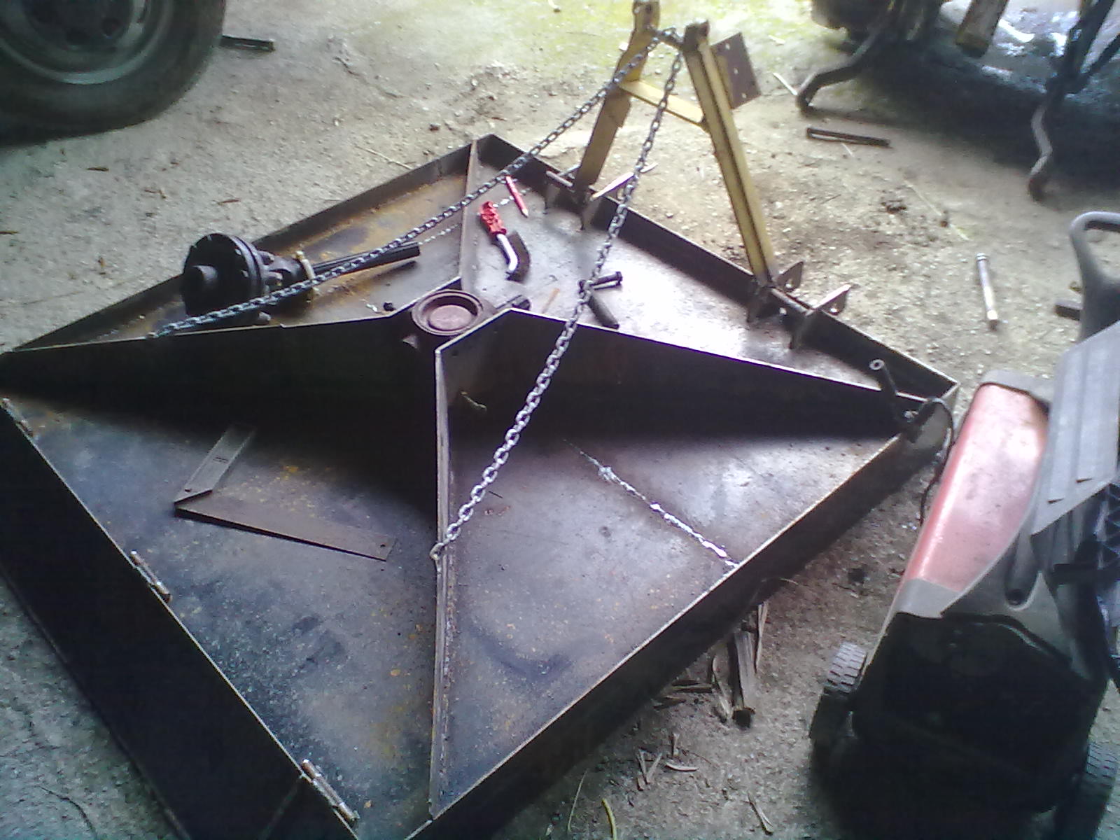 inizialmente era sterzante e completamente snodata per copiare bene il terreno,ma alla fine era poco guidabile e i vantaggi erano minimi,così l'ho bloccata con due traverse saldate.Le prove che ho fatto mi sembrano positive anche su erba moto dura e con ricacci di arbusti,l'altezza di taglio è fissa a 6cm,con diametro 80cm, il trinciato non è particolarmente raffinato,ma per il mio utilizzo è ottimo.