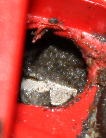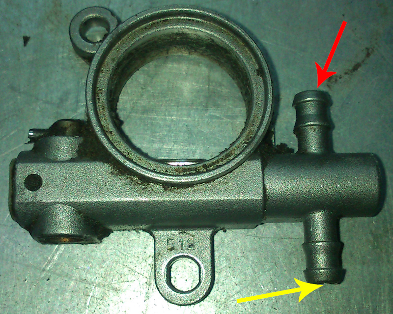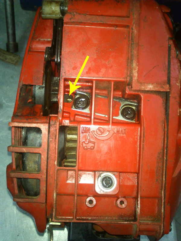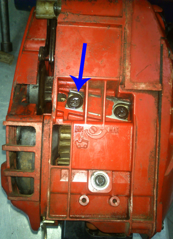 A scanso di equivoci allego una foto evidenziando con una freccia blu la vite che penso serva a regolare la mandata dell'olio catena.
