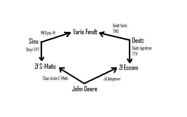 Detto questo il gruppo SDF prima JD e Claas poi usano il cambio di ZF mentre quello fabbricato in austria nelle ex fabbriche di Steyr viene prodotto l'altro cambio in esclusiva al gruppo CNH....