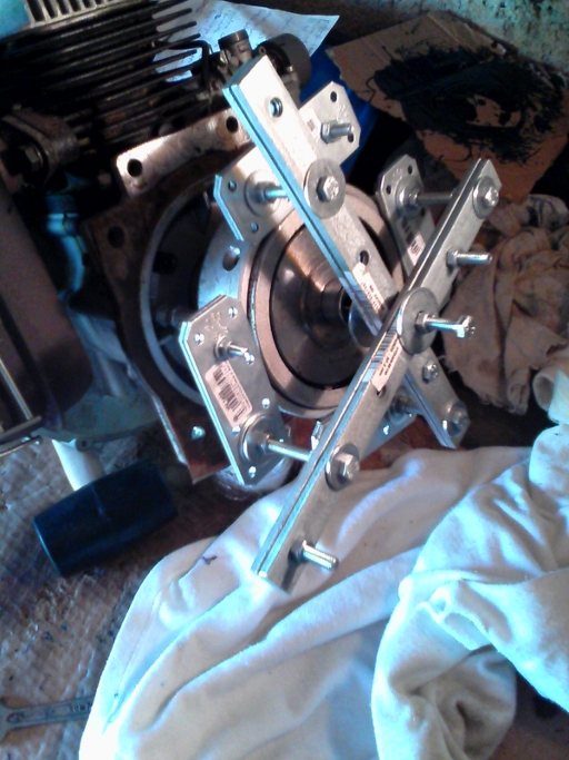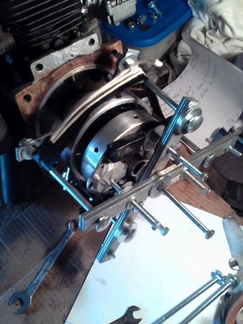 ho sfilato la frizione, costruendo 2 estrattori, uno che tira da fuori(frizione4.jpg) e uno che spinge da dentro(frizione5). C'è voluto qualche giro di vite di entrambi e la molla ha sparato fuori tutto quando mancava solo qualche millimetro.
