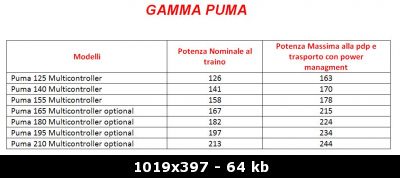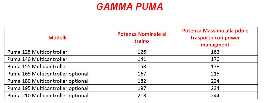 Le potenze dei Puma 165,180, 195 e 210 sono identiche a quelle dei rispettivi modelli NH T7000, mentre le potenze nominali con powerboost attivo dei modelli più piccoli ancora non ce l’ho, ma ve le fornirò al più presto.