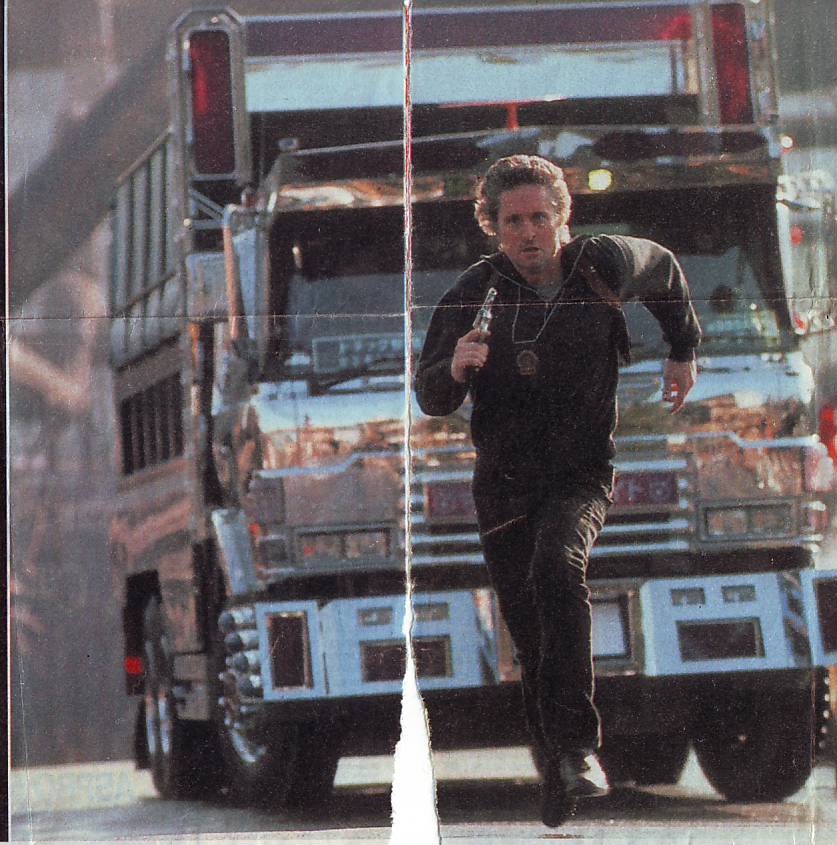 2)Una foto del film "Black Rain-Pioggia sporca"('89),in cui Michael Douglas apparentemente sembra inseguito da un camion da cantiere,mentre in realtà sta per scansarsi per non essere investito da questo,come si vede nel film(la marca pare Hino,però il dubbio mi rimane)