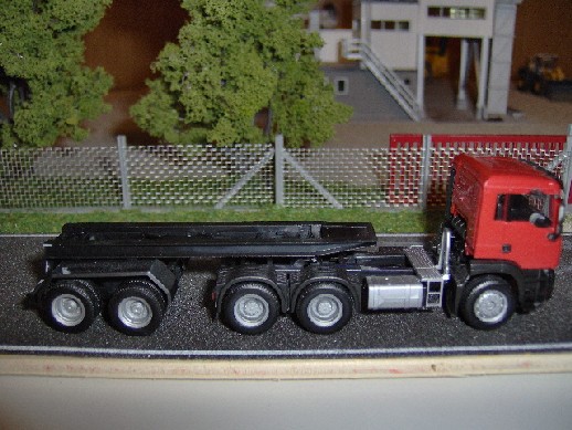 il semi l'ho preso su ebay, ho rifatto la parte centrale più stretta per porterci mettere il 375, e la parte in coda che copre le ruote, infine ho costruito i parafanghi dei deu assi anteriori e verniciato il tutto dello stesso colore del trakker e i cerchi in alluminio, adesso voglio farci gli adesivi a strisce bianche e rosse da mettere dietro e sui fianchi