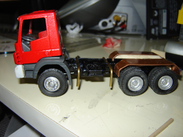 il trakker: tanto lavoro!! la cabina è uscita fuori da quella dell'eurotrakker, ho stuccato con la resina il davanti ed ho ricavato, nello spazio dove erano le fessure, quelle più fine della grigliua del trakker; paraurti anteriore autocostruito, in balsa ( io la uso tanto nelle mie modifiche); lo chassis viene da un mercedes al quale ho strappato tutto e rifatto serbatoio, serbatoi aria, marmitta e barre anti intrusione e parafanghi posteriori; il cassone è un pezzo che ho preso su ebay; l'adesivo "iveco trakker" l'ho ricavato da una foto frontale del trakker, ho scoperto che questa foto stampata con l'opzione 6 foto in 1 foglio, viene proprio in scala 1:50, e poi l'ho stampata su carta adesiva; il tuttu verniciato di rosso e nero lo chassis;