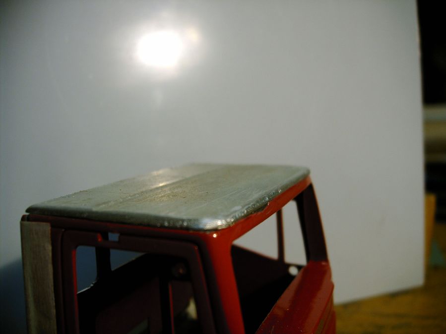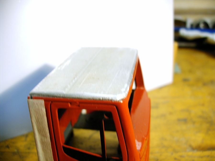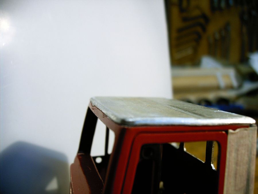 Sai, proprio ieri ho visto uno Stralis con sponde basse che aveva il tetto alto, quindi potresti lasciaro così, cmq se vuoi fare il tetto basso devi tagliare la lamiera sottile dove finisce la cabina vera e propria. Io ho usato una lamiera di alluminio spess. 2mm e ho smussato gli spigoli e ci ho fatto le venature di plastica. Devo dire che è venuto piuttosto bene.